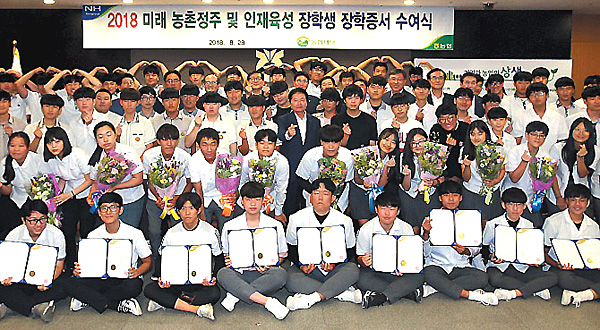 농협재단(이사장 김병원)은 지난달 28일 농협중앙회 본관 중회의실에서 ‘2018년 미래 농촌정주 및 인재육성 장학생 장학증서 수여식’을 갖고, 장학생 총 323명(농고생 200명, 농대생 73명, 일반 50명)에게 장학증서를 수여했다.〈사진〉