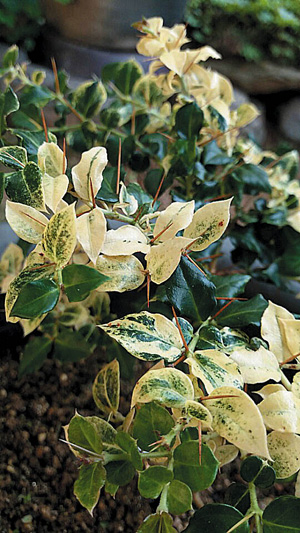 줄기에 1㎝ 내외의 가시가 있고 1년생 가지엔 털이 보이기도 한다. 잎은 마주나기를 하며 넓은 달걀형 또는 긴 달걀형으로 끝이 뾰족하다. 길이와 폭이 각각 1~1.5㎝, 폭이 7~20㎜이고 표면에 짙은 윤채가 있고 가장자리가 밋밋하다. 가시의 길이가 잎의 크기와 비슷하다.