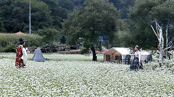 | 남녀 한 쌍이 메밀 꽃밭 속에 그림처럼 서있었다. |