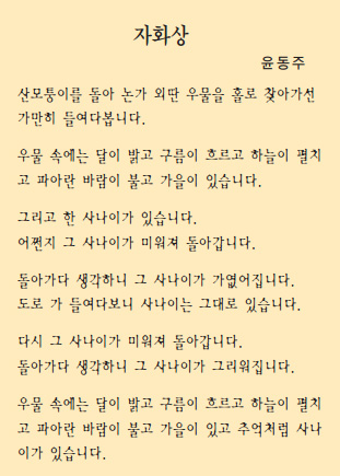 윤동주의 「자화상」은 식민지 시대를 살아가면서 행동하지 못하는 젊은 지식인의 자신에 대한 반성이자 고뇌이다. 미움과 연민이 교차하는 가운데서도 시인은 자신에 대한 성찰을 멈추지 않는다. 이 시는 ‘우물’을 통하여 자신의 내면을 들여다보며 고민과 갈등을 거듭하는 청년기의 자화상을 그대로 보여 주는 작품이라 하겠다.