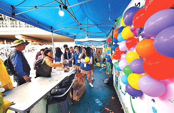| ‘네잎클로버 행운의 풍선’을 맞춰라! 예산예화여고4-H회에서 일반 시민들이 참가할 수 있는 풍선다트 체험장을 운영하고 체험을 하신 분들께 ‘햇살가득 예산사과즙’을 선물했다. |