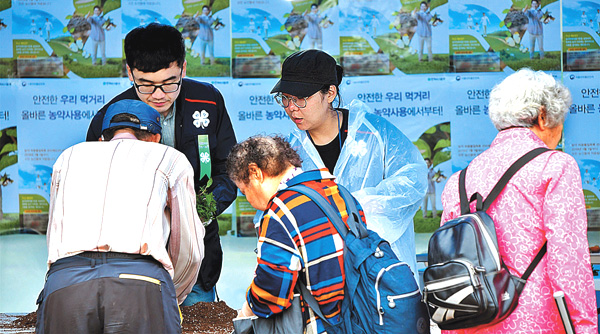 | 국민의 안전한 먹거리 생산을 위해 청년4-H회원들이 앞장선다! 농업인들에게 PLS제도를 홍보하고, 재활용컵을 이용한 새싹 인삼 심기 체험을 했다. |