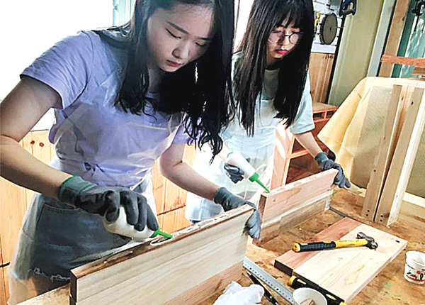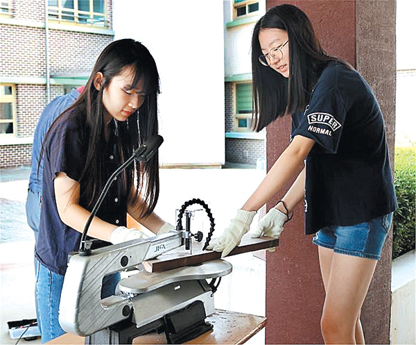 | 한 치의 오차도 없이…. 원목을 기계로 절단해 도마를 제작 중인 중학생 4-H회원들. |
