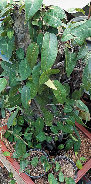 잎은 두꺼운 가죽질이고 어긋나기로 달린다. 모양은 피침형 또는 타원형의 피침형으로 끝이 뾰족해 진다. 길이 7~12㎝ 너비 2~4㎝로 가장자리는 밋밋하다. 표면에는 반들반들한 윤채가 있고 뒷면은 흰빛이 도는 엷은 녹색을 띈다. 잎맥이 그물처럼 튀어나온다.