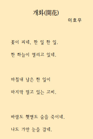 우리 집 베란다에는 온갖 종류의 다육이가 자라고 있다. 다육이는 꽃을 피우는 데 참 오래 걸린다. 꽃을 한 번도 보지 못하는 경우 애가 탈 지경이다. 하지만 마침내 꽃을 피우게 되면 큰 기쁨과 위안을 얻게 된다. 이호우의 「개화」는 제목이 암시하듯이 꽃이 피는 모습을 군더더기 없이 깔끔하게 그린 시조이다. 시인의 직관은 꽃이 피어나는 순간을 예리하게 포착하여 한 하늘이 열리고 새로운 우주가 완성되는 절정의 순간으로 받아들이고 있다. 이 시조는 초장에서 꽃이 한 잎 한 잎 피어나는 모습을 섬세하게 그린다. ‘한 하늘이 열리고 있네’라는 표현은 보잘것없는 꽃이라도 생명 탄생은 처음으로 하늘이 열리듯 거룩하고 신비로운 일임을 말해 준다. 종장은 개화의 절정과 완성을 ‘바람도 햇볕도 숨을 죽이네./나도 가만 눈을 감네.’라고 극적으로 표현한다. 나도 시인처럼 다육이가 꽃을 피우는 순간, 자연과 하나가 되어 생명 탄생을 숨죽인 채 지켜보며 그 감동을 함께 나누어야겠다.