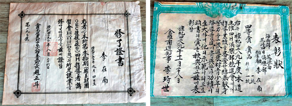 | 왼쪽 사진은 전남 해남 화봉4-H구락부 자원지도자인 이재남씨가 1957년 중견지도자양성소(농민교육원 전신)에서 중견지도자 양성과정 교육을 받은 수료증이다. 오른쪽 사진은 1956년 11월 28일 전라남도 주관으로 최초로 개최한 전남4-H경진대회에서 4등상을 수상한 표창장이다. 부상은 농경지를 평평하게 고를 때 사용한 농기구인 레커였다. 이 두 자료는 이재남씨의 장남인 이명흠씨(68세)가 소장하고 있다. 〈사진 제공 : 홍순민 전남4-H본부 부회장〉 |