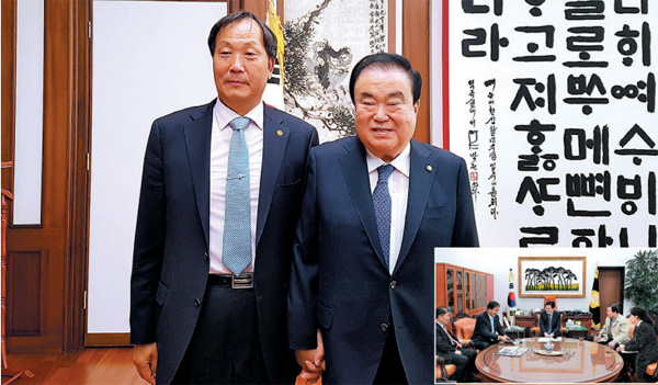 | 고문삼 한국4-H본부 회장은 지난달 30일 문희상 국회의장을 예방해 4-H에 지속적 관심과 지원을 당부했다. 작은 사진은 같은 날 주승용 국회부의장과 환담 장면. |