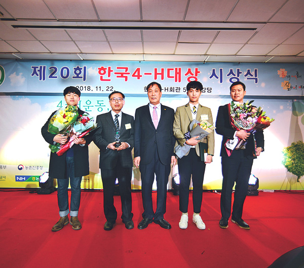 | 〈농촌진흥청장상〉 (왼쪽부터) 김호영 전남4-H연합회 수석남부회장, 주성민 충남4-H연합회 부회장, 박경숙 농촌진흥청 지도정책과장, 경기 화현초4-H회(허승희 지도교사), 제주 삼성여고4-H회(김경희 지도교사) |