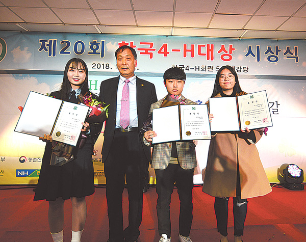 | 〈한국4-H국제교류협회장상〉 (왼쪽부터) 이현섭 인천 강화군4-H연합회장, 이기양 한국4-H국제교류협회장, 박민영 대구 달성군4-H연합회 여부회장, 서울 대동세무고4-H회(노영준 회원) |