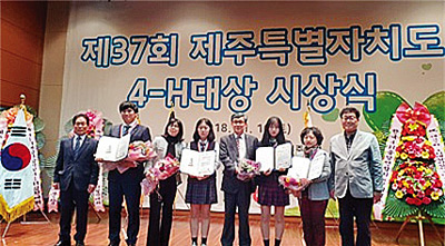 제주일보(회장 김대형)와 제주특별자치도농업기술원(원장 송승운)이 주최하고 제주도4-H본부(회장 하부윤)와 제주특별자치도개발공사(사장 오경수)가 후원한‘제37회 제주특별자치도 4-H대상 시상식’이 지난달 10일 서귀포시 국립종자원 제주지원 대강당에서 열렸다.〈사진〉