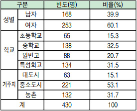 남자 168명(39.9%), 여자 253명(60.1%)으로 나타났다. 학교급별로는 초등학교 65명(15.3%), 중학교 138명(32.5%), 고등학교 222명(62.2%)이었으며, 이중 일반고는 88명(20.7%), 특성화고는 134명(31.5%)이었다. 거주지는 중소도시가 221명(53.1%)으로 가장 많았으며, 농촌 132명(31.7%), 대도시 63명(15.1%)으로 나타났다.
