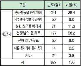 4-H회 가입동기는 복수로 응답이 가능하도록 조사했다. 가장 많은 응답을 보인 항목은 ‘봉사활동을 하기 위해’가 241명(38.4%)이었으며, 다음은 ‘선생님의 권유로’가 177명(28.2%)으로 나타났다. 다음은 ‘친한 친구를 따라서’, ‘선배의 권유로’, ‘마음껏 놀 수 있을 것 같아서’ 등의 순서로 나타났다. 〈표2〉