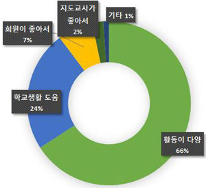 4-H회 활동에 대해 만족하는 이유를 묻는 질문은 복수 응답이 가능하도록 하였다. ‘활동이 다양해서’가 65.9%로 가장 높게 나타났으며, ‘학교생활·공부에 도움’이 23.8%로 대부분 청소년들이 학교4-H회를 통해 많은 도움을 받고 있는 것으로 인식하고 있음을 알 수 있었다. 〈그림5〉