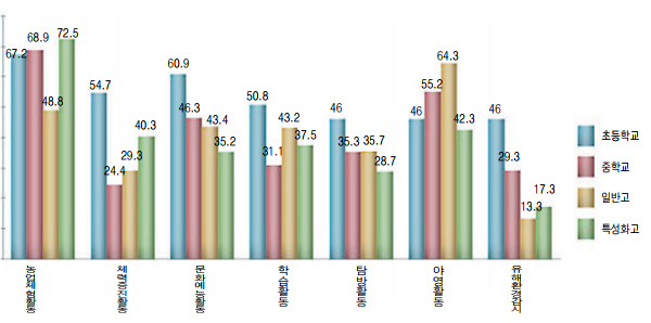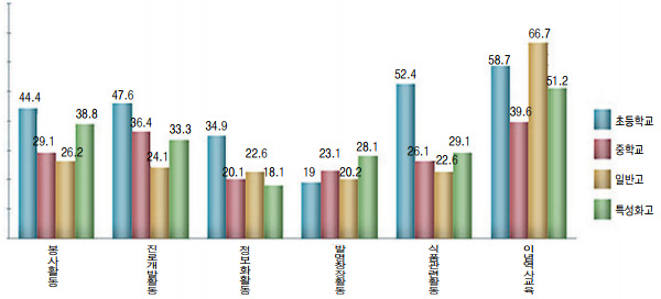 회원들이 재학중인 학교급별에 따른 프로그램별 참여비율에 대해 살펴보면, 다소 큰 차이를 보이고 있었다. 〈그림2〉 농업체험활동의 경우 초등학교, 중학교, 특성화고의 경우 70%내외의 회원들이 참여하고 있는 반면에 일반고의 경우 48.8%로 절반에 미치지 못하였다.