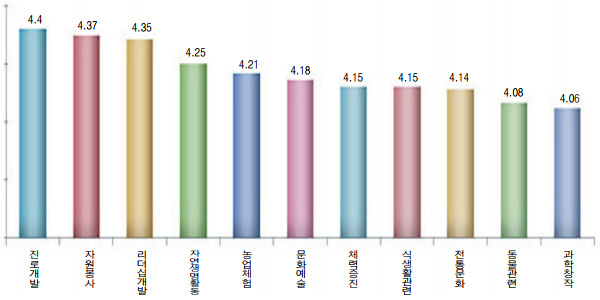 학생4-H회원들이 각각의 활동에 대해 어느 정도 선호하는지를 조사했다. 〈그림3〉 모든 활동에 대해 대체로 높은 점수분포를 나타냈는데, 가장 높은 점수를 나타낸 항목은 ‘진로개발활동’으로 나타났다.