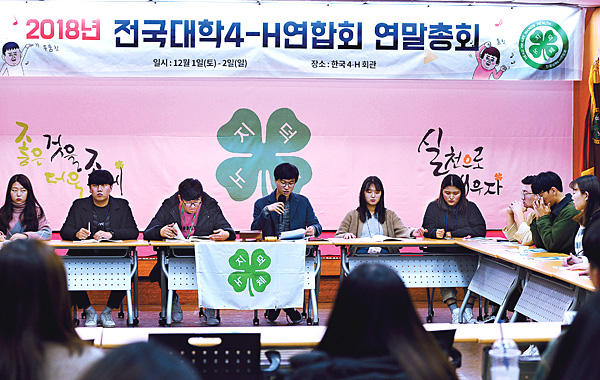 전국대학4-H연합회(회장 조낙민·진주교육대)는 지난 1~2일 한국4-H회관에서 연말총회를 개최했다.<사진> 이날 총회에서 대의원들은 회장, 남녀 부회장 각 1인, 감사 2인을 선출하고 내년 대학4-H를 위해 봉사할 임원단을 새롭게 꾸렸다.
