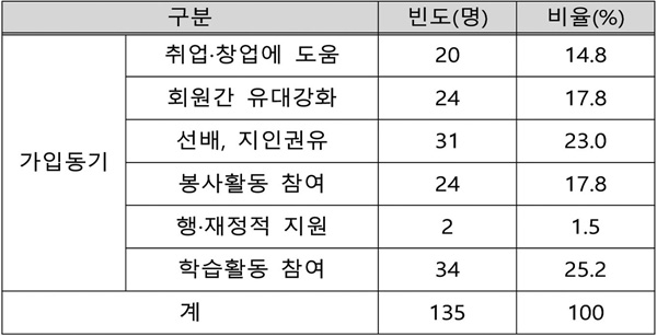 4-H회 가입동기는 복수로 응답가능하도록 하여 조사하였다. 가장 높은 응답률을 나타낸 항목은 ‘학습활동 참여’가 34명(25.2%)으로 가장 높았으며, ‘회원간 유대강화’, ‘봉사활동 참여’가 각각 24명(17.8%), ‘취창업에 도움’은 20명(14.8%) 순으로 나타났다.