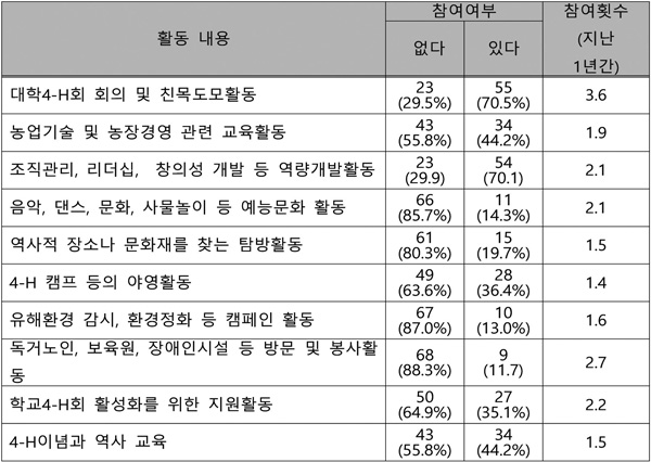 회원들이 4-H회를 통해서 지난 1년간 10가지 활동에 대해 참여 여부와 참여 횟수를 조사하였다. 참여 횟수는 참여 여부에서 참여한 적이 있다고 응답한 회원들의 평균을 산출하였다. 가장 많이 참여한 활동은 ‘대학4-H회 회의 및 친목도모활동’으로 55명(70.5%)이 참여했으며, 참여 횟수는 평균 3.6회로 나타났다. 다음으로 참여 비율이 높은 활동은 ‘조직관리, 리더십, 창의성 개발 등 역량개발활동’으로 54명(70.1%)이 참여했다.