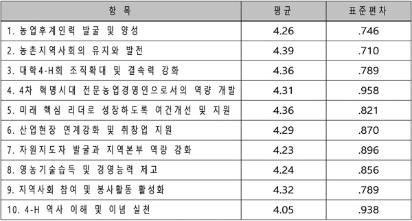 대학4-H회가 추구해야 할 목표에 대해 문항은 5점 리커크척도를 사용하였으며, 평균의 분포는 1점~5점 사이에 분포하도록 하였다. 평균의 분포는 4.05점부터 4.39점까지로 대체로 모든 항목에 대해 높은 점수를 보이고 있었다. 가장 평균이 높은 항목은 ‘농촌지역사회의 유지와 발전’이었으며, 가장 낮은 점수를 나타낸 것은 ‘4-H역사 이해 및 이념 실천’으로 나타났다.