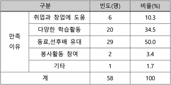 4-H회 활동에 대해 만족하는 이유를 묻는 질문에서 ‘동료·선후배간 유대’가 29명(50.0%)으로 가장 높게 나타났으며, ‘다양한 학습활동’이 20명(34.5%), ‘취업과 창업에 도움 ’이 6명(10.3%) 순으로 나타났다.