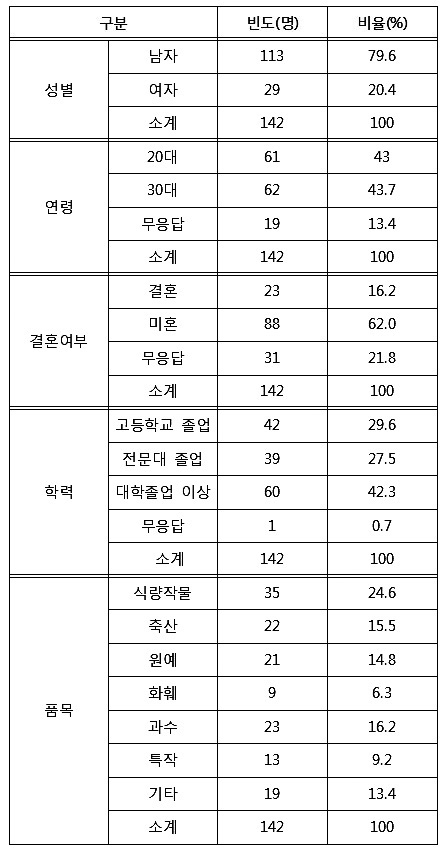 연령별로는 20대와 30대가 43%, 43.7%로 거의 비슷하였으며, 학력은 고등학교 졸업이 42명(29.6%), 전문대졸이 39명(27.5%), 대학졸업 이상이 60명(42.3%)으로 대학졸업 이상이 가장 많은 분포를 보였다.