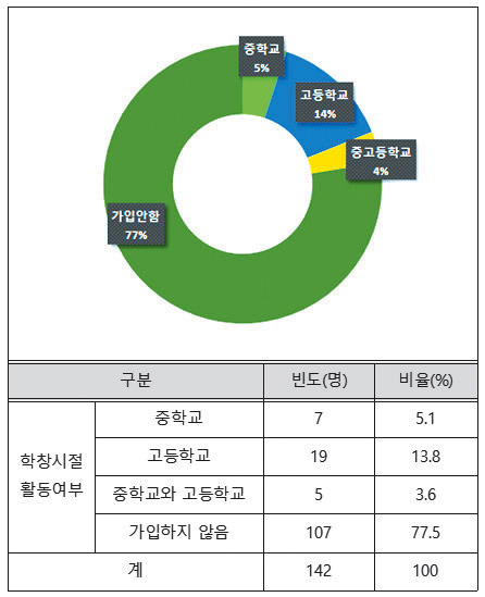 학창시절 4-H활동 여부를 묻는 질문에서 중학교와 고등학교 시절 4-H회 활동을 하지 않은 회원이 107명(77.5%)으로 가장 많은 분포를 나타냈으며, 고등학교 재학시절 활동한 회원이 19명(13.8%), 중학교 재학시절 활동한 회원이 7명(5.1%), 중학교와 고등학교 재학시 활동한 회원이 5명(3.6%)으로 나타났다.