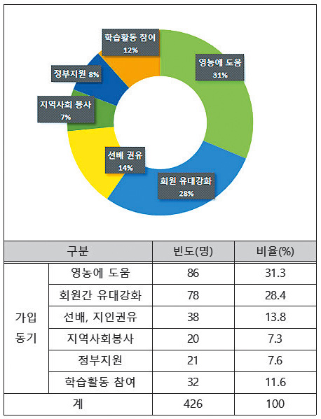 4-H회 가입동기는 복수로 응답 가능하도록 하여 조사하였다. 가장 높은 응답률은 나타낸 항목은 ‘영농활동에 도움이 될 것 같아서’를 86명(31.3%)이 선택하였으며, ‘회원간 유대강화를 위해서’,‘선배나 지인의 권유로’, ‘다양한 학습활동에 참여하기 위해서’,‘정부나 지자체의 지원을 받기 위해서’, ‘지역사회에 봉사하기 위해서’ 순으로 나타났다.