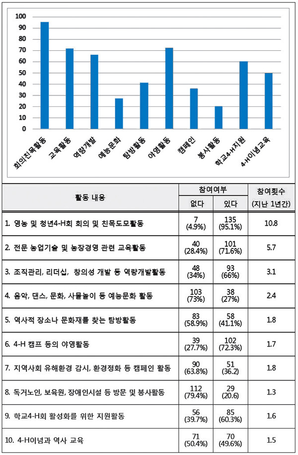 가장 많이 참여한 활동은 ‘영농 및 청년4-H회 회의 및 친목도모활동‘으로 135명(95.1%)이 참여했으며, 참여횟수도 10.8회 정도로 월 1회 정도 참여하는 것으로 나타났다.