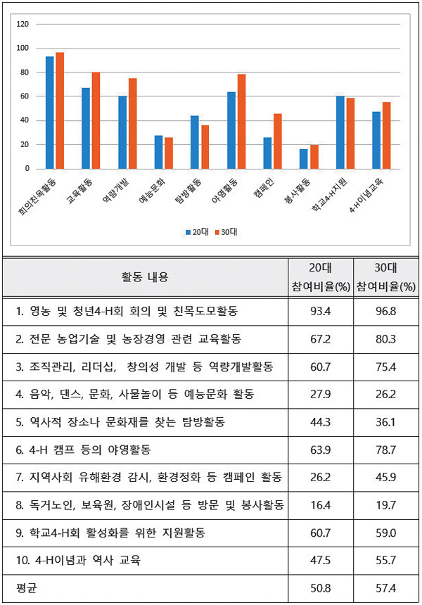 다음으로 참여 비율이 높은 활동은 ’4-H 캠프 등의 야영활동‘이었으며, ’전문농업기술 및 농장경영 관련 교육활동‘, ’조직관리, 리더십, 창의성 개발 등 역량개발활동‘, ’학교4-H 활성화를 위한 지원활동‘ 순으로 나타났다.