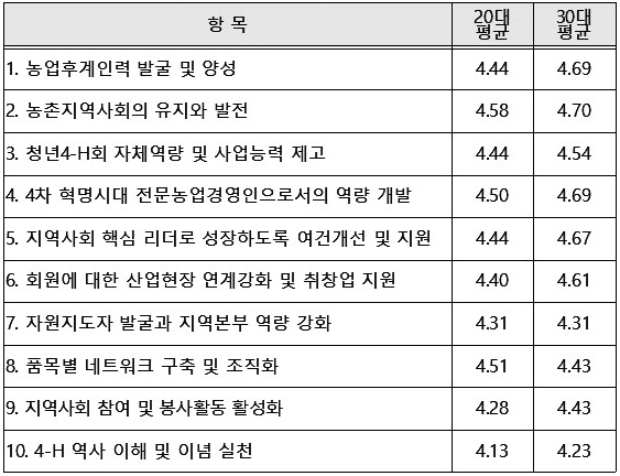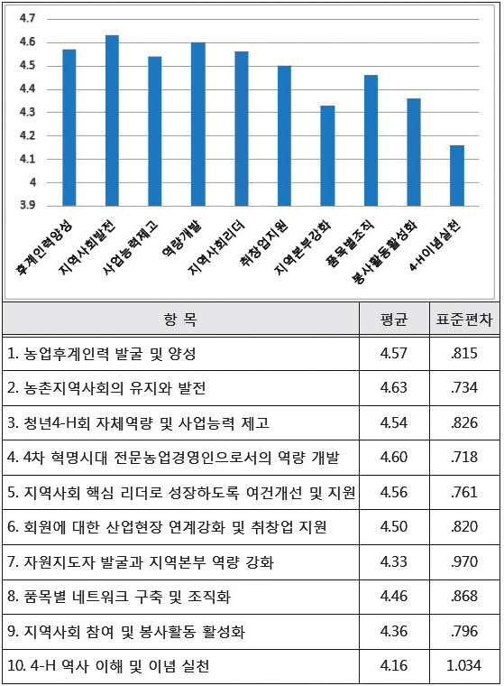 가장 평균이 높은 항목은 ‘농촌지역사회의 유지와 발전’이었으며, 가장 낮은 점수를 나타낸 것은 ‘4-H역사 이해 및 이념 실천’으로 나타났다.