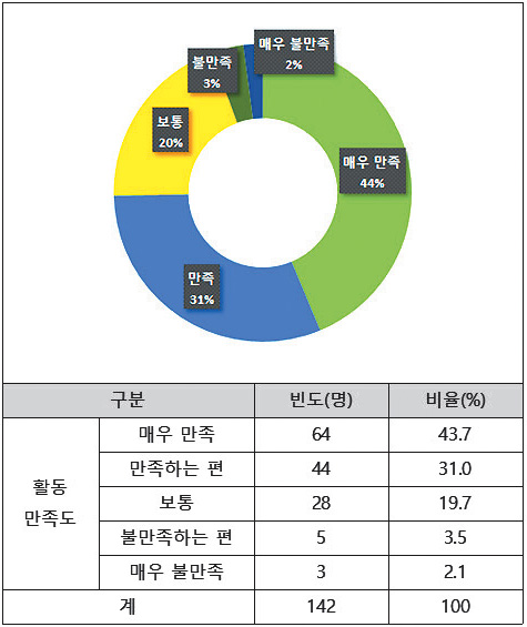 청년4-H회 참여와 관련된 회원들의 의견을 묻는 질문에 대해 ‘매우 만족’에 응답한 비율이 43.7%, ‘만족하는 편’에 응답한 비율이 31.0%로 74.7%의 응답자가 4-H회 활동에 만족하다고 응답하였다. 불만족하는 비율은 ‘불만족하는 편’이 3.5%, ‘매우 불만족’이 2.1%로 소수에 그치는 것으로 나타났다.