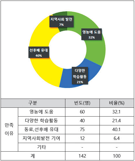 4-H회 활동에 대해 만족하는 이유를 묻는 질문은 복수 응답이 가능하도록 하였다. ‘동료·선후배간 유대’가 40.1%로 가장 높게 나타났으며, ‘영농에 도움’이 32.1%, ‘다양한 학습활동 ’이 21.4%, ‘지역사회 발전에 기여’가 6.4%로 나타났다.
