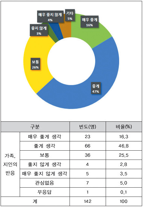 가족이나 지인들이 4-H활동에 참여하는 것에 대해 어떻게 생각하는지를 묻는 질문에서 ‘매우 좋게 생각’이 16.3%, ‘좋게 생각’이 46.8%로 긍정적인 응답 비율이 53.1%로 나타났다. ‘좋지 않게 생각’은 6.4%와 ‘매우 좋지 않게 생각’은 3.5%로 부정적인 응답 비율은 9.9%로 나타났다.