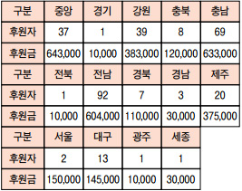 강원 △김효주(프로골퍼) 5만원 △한기덕(한국4-H본부) 2만원 △권경희(강원도4-H본부) 1만원 △권혁미(강원농업기술원) 1만원 △김남석(강원도농업기술원) 1만원 △김상수(강원도농업기술원) 1만원 △김수환(강원도농업기술원) 1만원 △김영석(농촌지도자강원도연합회) 1만원 △김영진(강원도농업기술원) 1만원 △박미진(강원도농업기술원) 1만원 △박병석(농촌진흥청) 1만원 △박영식(강원도농업기술원) 1만원 △변선배(강원도농업기술원) 1만원 △안연숙(강원도농업기술원) 1만원 △안우영(강원도농업기술원) 1만원 △유범선(강원도농업기술원) 1만원 △유택근(강원도농업기술원) 1만원 △윤병언(강원도농업기술원) 1만원 △이기옥(강원도농업기술원) 1만원 △이문환(강원도4-H본부) 1만원 △이여진(강원도농업기술원) 1만원 △장은하(강원도농업기술원) 1만원 △정정수(강원도농업기술원) 1만원 △정햇님(강원도농업기술원) 1만원 △최금탁(수하향토농장) 1만원 △최기호(강원도4-H본부) 1만원 △최종태(강원도농업기술원) 1만원 △황동근(강원도농업기술원) 1만원 △김영순(강원도농업기술원) 5천원 △문명선(강원도농업기술원) 5천원 △박영학(강원도농업기술원) 5천원 △박종원(강원도농업기술원) 5천원 △변옥주(강원도농업기술원) 5천원 △유윤정(강원도4-H본부) 5천원 △장미정(강원도농업기술원) 5천원 △전금정(강원도농업기술원) 5천원 △조병주(강원도농업기술원) 5천원 △최병곤(강원도농업기술원) 5천원 △이제창(강원도농업기술원) 3천원