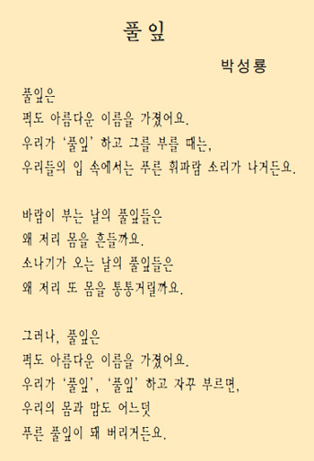 이 시는 ‘바람이 부는 날의 풀잎들’과 ‘소나기가 오는 날의 풀잎들’의 움직임을 포착하여 풀잎의 역동적인 모습과 싱싱한 생명력을 생동감 있게 나타냈다. 그리고 ‘우리가 ‘풀잎’, ‘풀잎’ 하고 자꾸 부르면,/우리의 몸과 맘도 어느덧/푸른 풀잎이 돼 버리거든요.’라고 하여 자연과 인간이 하나가 되는 경지를 보여 준다.
