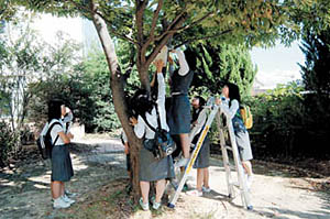 <회원들이 직접 제작한 새집을 교내 나무에 달고 있다.>