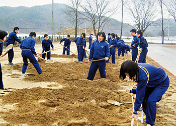| <노는 땅을 밭으로 만들기 위해 구슬땀을 흘리고 있는 4-H회원들.> |