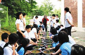 김태희 교감의 전폭적인 지지와 지도로 이뤄지는 농사체험 활동은 학교 뒤편 공터를 이용해 상추, 부추, 마늘, 시금치, 아욱 등 10여 가지가 넘는 채소를 키우며 농심을 키워가고 있다. 커다란 화분에는 거름흙이 가득 담겨 있다. 후에 심을 국화와 꽃들을 심기 위해서 이다.