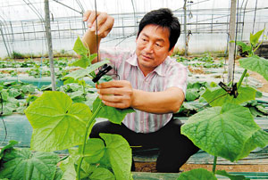 | <많은 어려움 속에서도 포기하지 않고 꿋꿋이 농사를 짓고 있는 김환수 부회장. 오이줄기를 유인하고 있다.> |