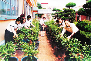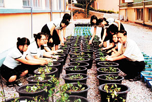 | 교사와 교사사이에 큰 화분으로 고추와 가지를 재배하고 있는 논산여중4-H회원들. |