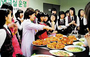 <우리음식 만들기 체험교실에서 먹음직스런 김치와 떡에 대해 설명듣는 회원들.> |