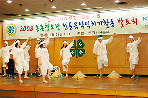 | <한국4-H본부가 주관한 ‘2008 농촌청소년 전통음악익히기활동 발표회’에서 예천통명농요를 시연하고 있는 모습.> |