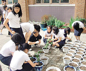 | 화분에 국화를 심고 있는 4-H회원들. 국화 화분에 자신의 이름을 붙여놓고 직접 관리한다. |