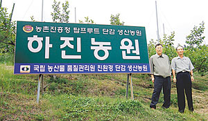 | <하진농원 입구에서 이원홍 경남4-H본부 사무국장(왼쪽)과 함께 한 하왕봉 회장.> |