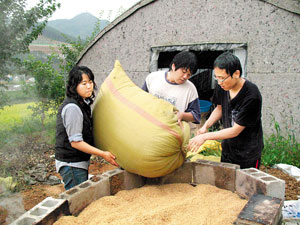 | <안지인 회원이 4-H연합회 회원들의 도움을 받아 버섯재배용 톱밥을 정리하고 있다.> |