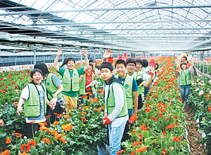 | 김해화훼단지를 찾아 화훼농장을 둘러본 후 함박 웃음을 터뜨리는 월산중4-H회원들. |