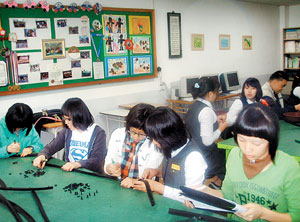 | 장애인 복지시설인 ‘한마음 학원’을 찾아가 장애우의 직업재활훈련을 돕고 있는 모습. |