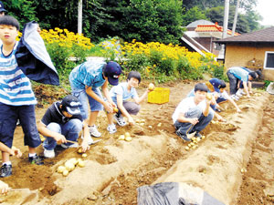| 농촌체험활동을 통해 직접 흙을 고르며 감자를 캐고 있는 우신초4-H회 회원들. |