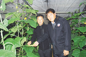 <울진군농업기술센터 전은우 계장(왼쪽)과 함께 오이하우스를 돌아보고 있는 이명창 회장.>