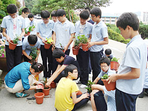 | 고목나무, 홍콩야자 등 공기정화화초를 가꾸고 있는 문성중4-H회원들. 회원들이 기른 화초는 교내 곳곳에 자리잡고 있다. |